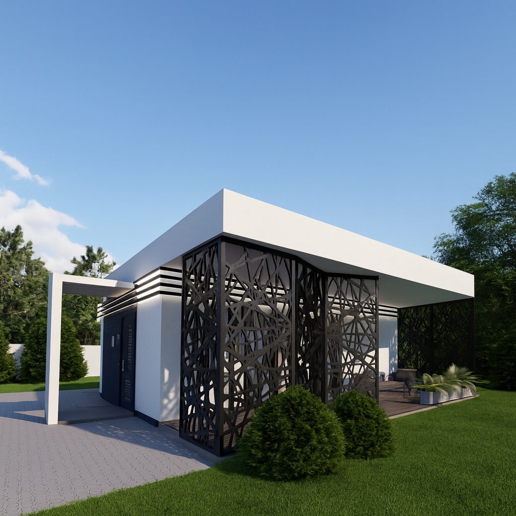Tento dům je vybaven rovnou střechou, která kombinuje moderní vzhled s vysokou funkčností.